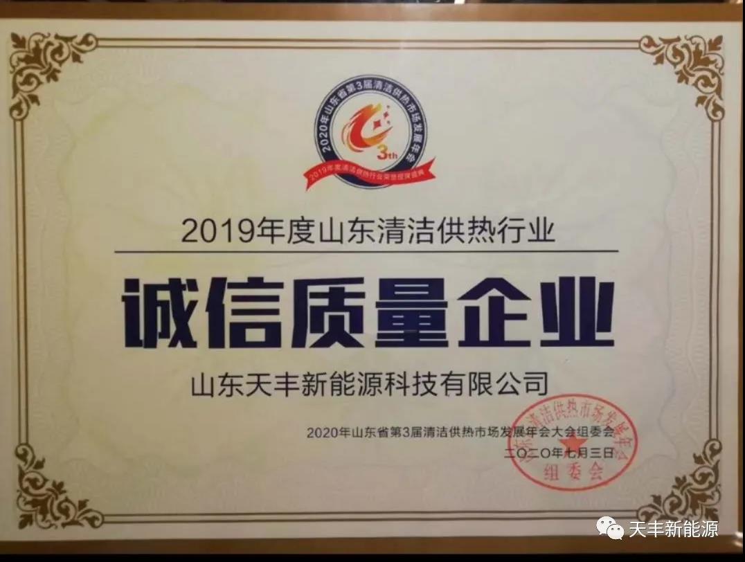 7月3日,山東省第3屆清潔供熱市場發(fā)展年會在濟(jì)南召開,山東天豐新能源科技有限公司受邀參加本次會議,在大會版塊“2019年度清潔供熱行業(yè)榮譽(yù)授牌儀式”上,天豐新能源斬獲“誠信質(zhì)量企業(yè)”榮譽(yù)授牌,再一次佐證天豐產(chǎn)品質(zhì)量與品牌信譽(yù)的良好口碑。